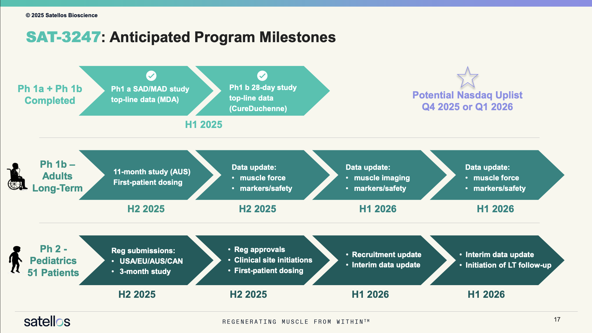 Recent safety setbacks with Sarepta’s Elevidys, including multiple patient deaths from liver failure in 2025 and subsequent FDA clinical holds, highlight the risks of AAV-based gene therapies. This could create an advantage for safer, oral small molecules, such as SAT-3247, which avoid invasive delivery and immune response issues. It is worth noting that, while Sarepta and others focus on muscle fiber and dystrophin production, SAT-3247 targets muscle stem cells, restoring their ability to generate new muscle. Satellos believes that SAT-3247, as an oral small molecule with a dystrophin-independent mechanism of action, could be widely used in DMD patients across all age groups, regardless of ambulation status or background medications.