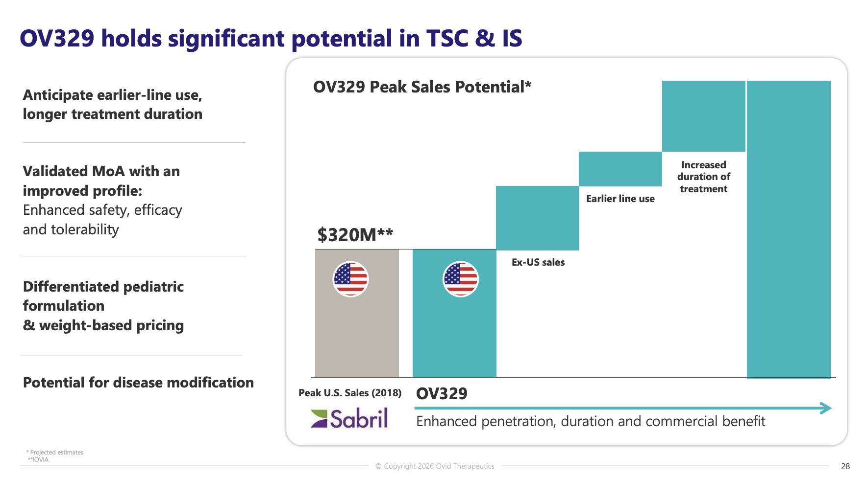 Ovid is developing a unique liquid formulation of OV329 for the TSC and IS populations. OV329 will also use weight-based dosing for these indications. We highlight this mainly to emphasize that it will be a very different product from the oral capsule being developed for FOS.